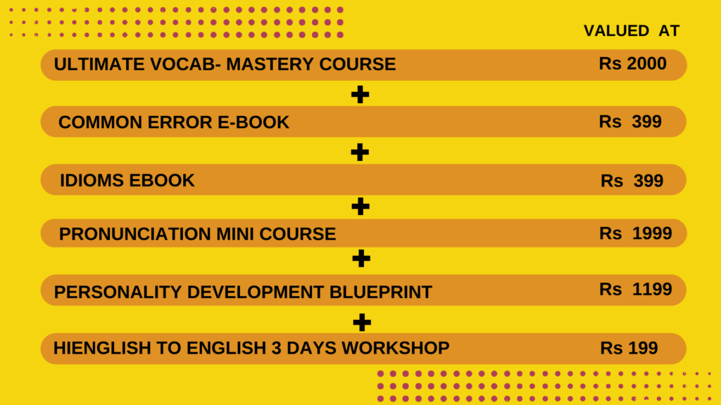 Pronunciation mini course एक ऐसा course है जो आपके pronunciation को बेहतर करने में आपकी मदद करता है और आपकी English को next level पर ले जाने के लिए एक map की तरह काम करता है । यह video course की कीमत Rs.1999 से भी अधिक होती है। but अभी इस कोर्स में enroll करने आपको यह फ्री मिलेगी।